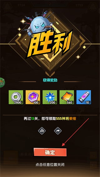 4、击败BOSS后触发胜利界面,点击确定领取奖励,推进关卡进度。
