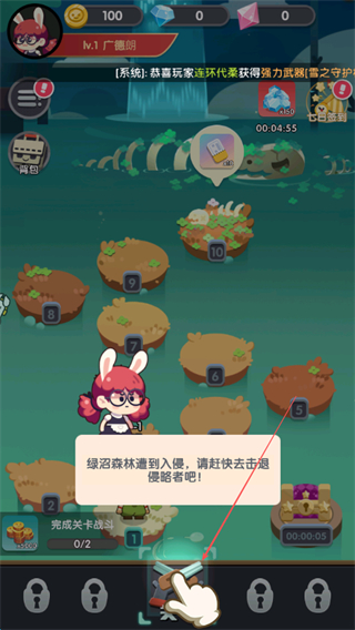 1、接取绿麻森林遭到入侵任务,点击对应关卡,准备进入第1-1关挑战。