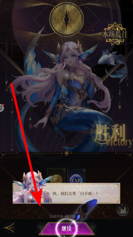4、最后推进剧情,战斗胜利后,会显示胜利界面,同时会有剧情提示,我们去帮白羊座,点击继续按钮,就能推进剧情,开启后续游戏内容。