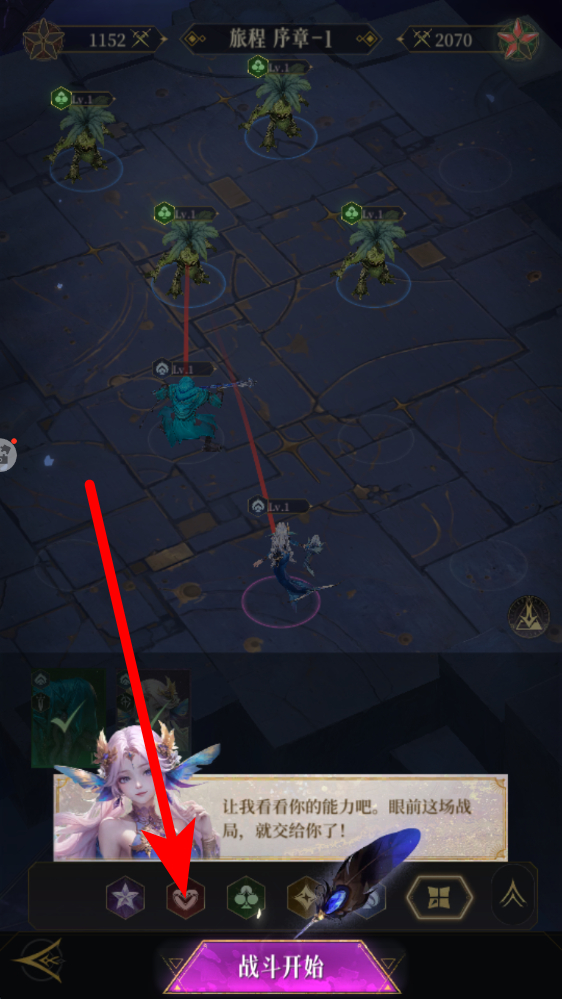 2、进入战斗准备后,能看到敌方与我方角色分布,下方有各类功能,点击对应图标可查看或调整战斗设置,之后点击开始,正式进入战斗。