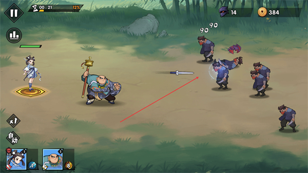 2、解锁持锤伙伴并上阵,协同白衣角色攻击敌方,获取金币384与击杀数14。