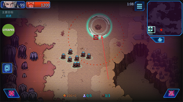 2、操控战斗机器人队伍,沿地图路径移动,靠近目标区域推进营救进程。