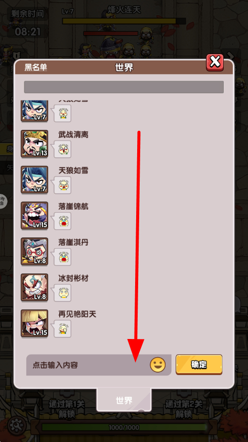 4、可与其他玩家进行交流互动,输入想要发送的内容,点击确定,就能将信息发送到世界频道,和其他玩家分享心得或交流策略。