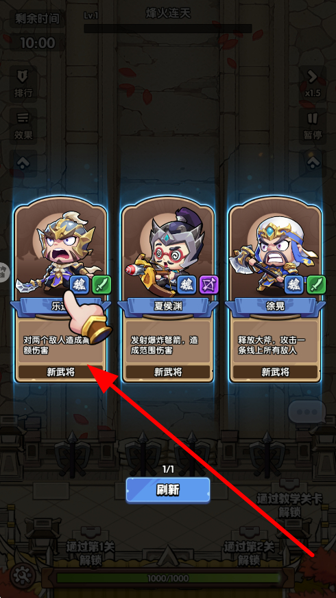2、在武将选择的界面,出现会展示出多个武将,每个武将都有独特的技能效果,玩家可挑选合适的武将,助力战斗顺利进行。