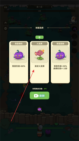 2、升级时选择技能火龙果,发射火龙弹,增强攻击能力。