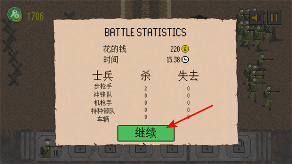 2、查看战斗统计,在战斗统计界面,查看数据,总结战斗情况,为后续策略调整提供依据,点击继续按钮推进游戏进程。
