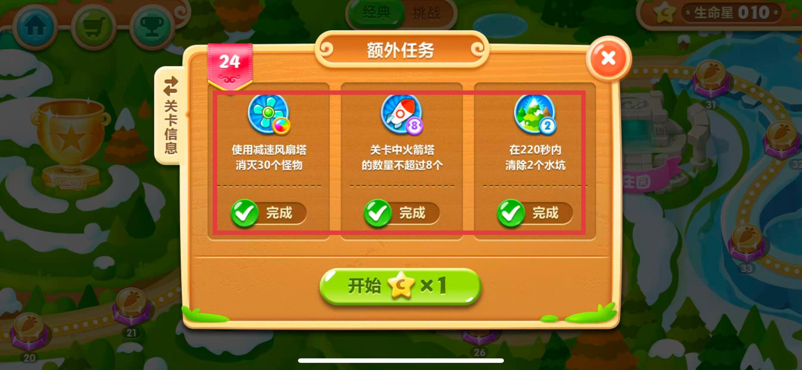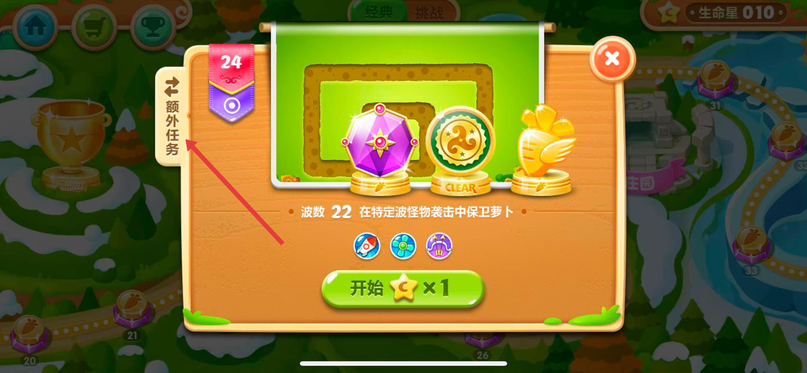 3、查看本关卡的额外任务要求,按照标准进行游戏,即可获得水晶萝卜。