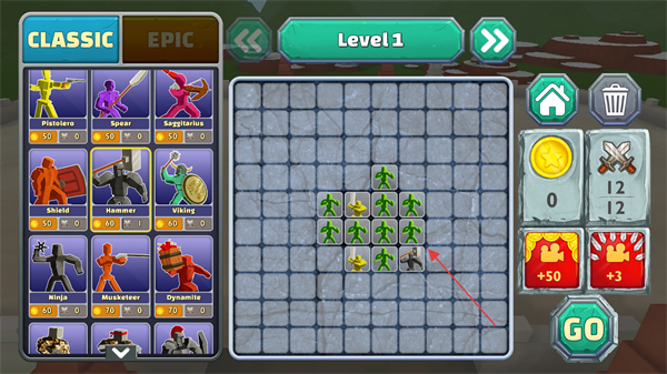 1、在Level1界面布置兵种到棋盘,组建军队后点击GO。