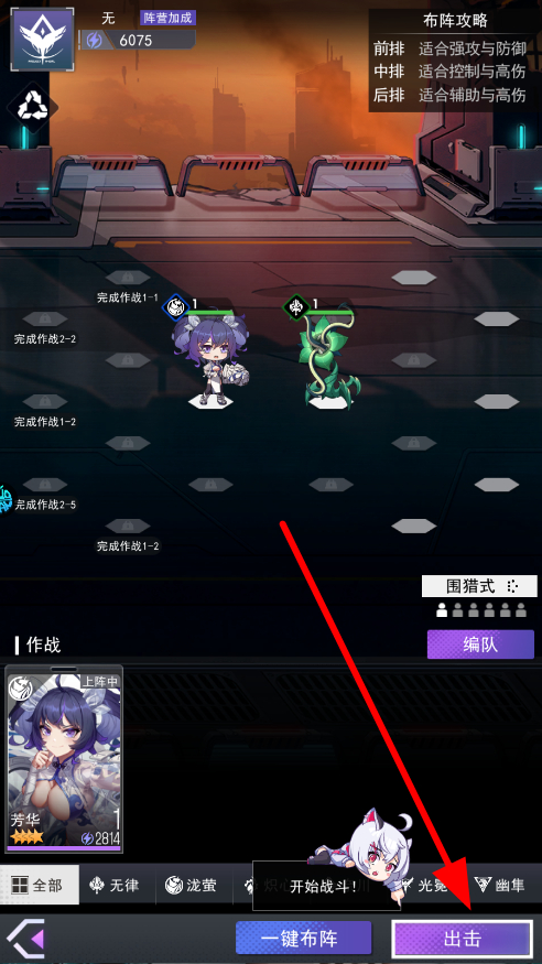 3、在作战界面,可查看布阵攻略,了解不同位置的作用,然后点击出击,指挥角色投入战斗,出击与敌人展开对抗,推进冒险进程。