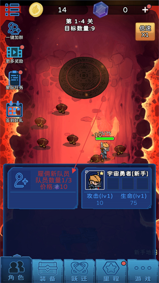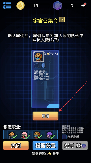 1、在1.4关界面,点击雇佣新队员按钮,消耗10金币进入招募界面。