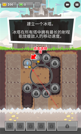 2、花费金币建立冰塔,冰塔射程长且能放缓敌人移动速度。