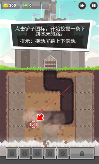 1、点击铲子图标挖掘通往冰床的路,拖动屏幕可上下滚动查看场景。