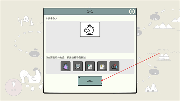 2、在1-1关卡界面选物品后点战斗,挑战本关敌人小鸡。