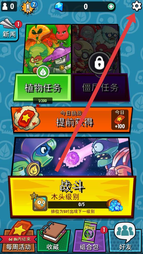 1、打开植物大战僵尸英雄进入主界面,点击右上角的设置图标。