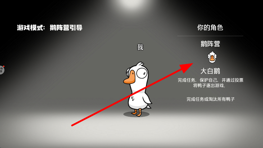 2、选择不同的阵营,像鹅阵营等,以大白鹅角色为例,需完成任务、保护自己,并通过投票将鸭子逐出游戏,明确阵营目标,开展游戏。