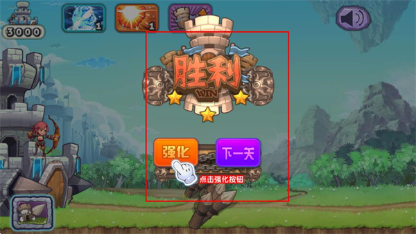 4、完成关卡后,界面显示“胜利”,可点击“强化”或“下一关”按钮进行后续操作。