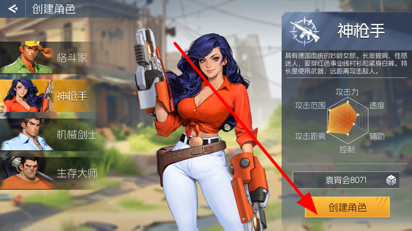 1、玩家开始游戏,角色创建界面挑选喜欢的角色,如神枪手等,确定后点击创建角色,正式踏入游戏世界,开启冒险征程。