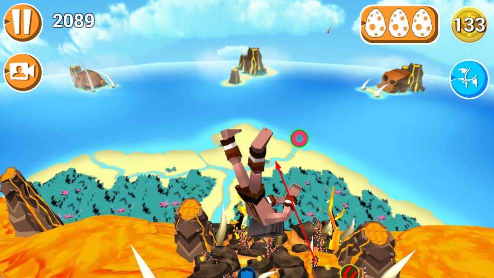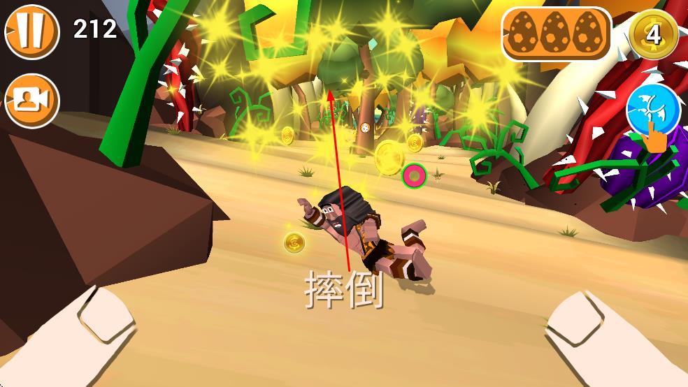 1、进入游戏后,通过滑动屏幕控制原始人移动方向,躲避路上的障碍物,像带刺植物等,同时收集金币,若不慎碰到障碍物,原始人会摔倒,影响行进。