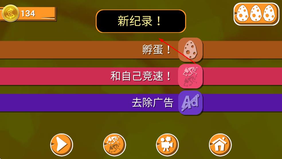 3、当游戏结束后,会显示新纪录等界面,此时可以选择“孵蛋”获取新内容,或者“和自己竞速”挑战之前的成绩,也能选择“去除广告”获得更流畅的游戏体验。