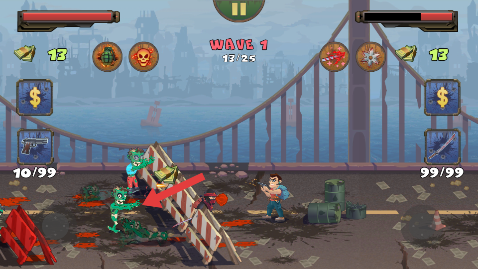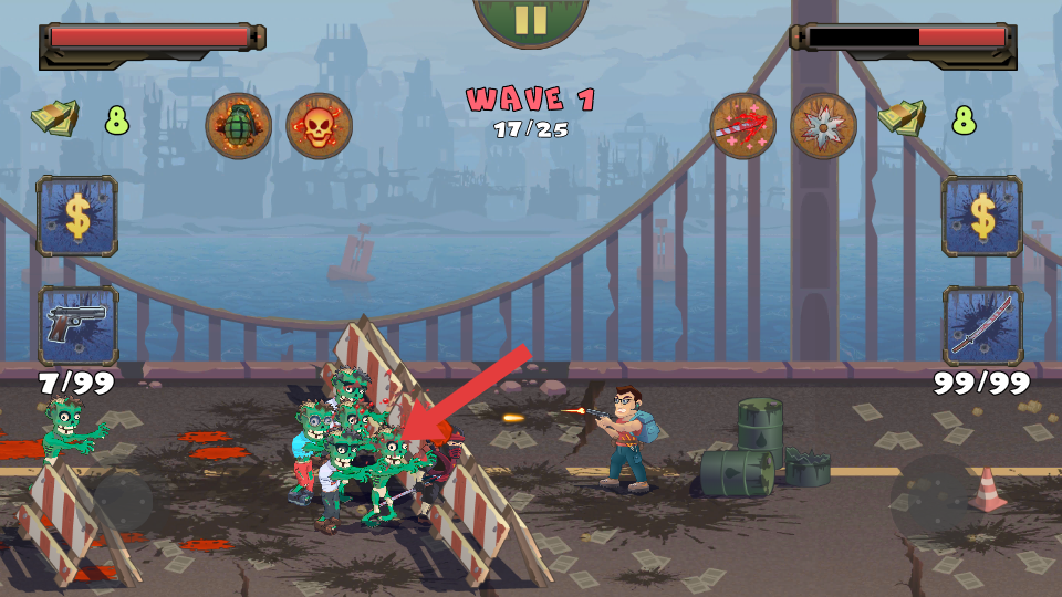 2、当僵尸靠近时,注意箭头指向的僵尸移动方向,操控角色移动,躲避僵尸的攻击,同时寻找合适的射击角度,僵尸输出伤害。