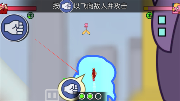 1、点击拳头按钮,操控角色飞向敌人并攻击,在蓝色区域内发起进攻。
