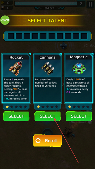 2、升级时选择天赋,如Cannons可增加子弹数量,提升战力。