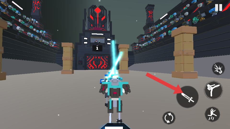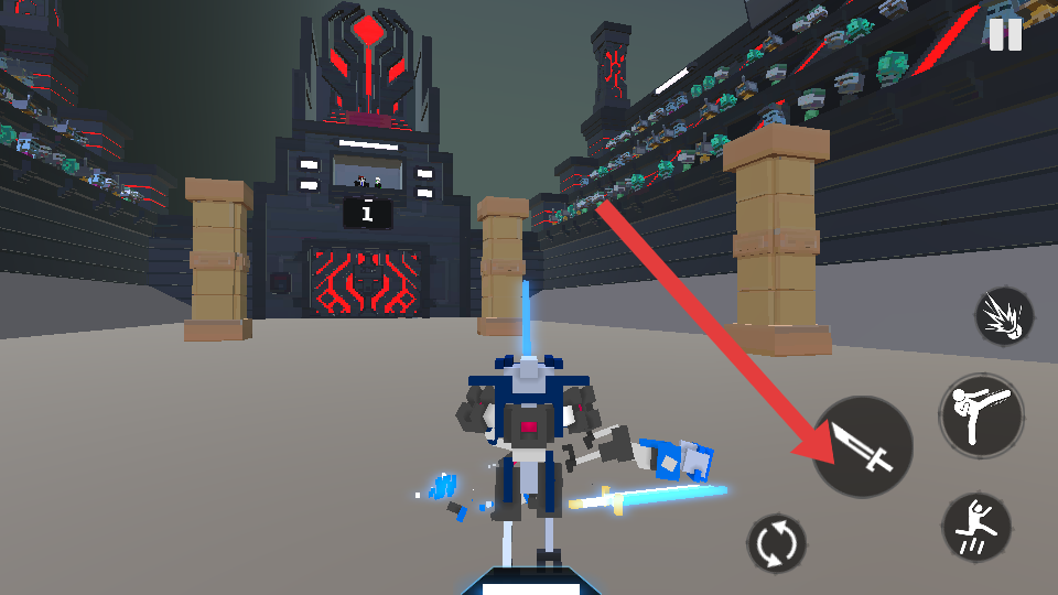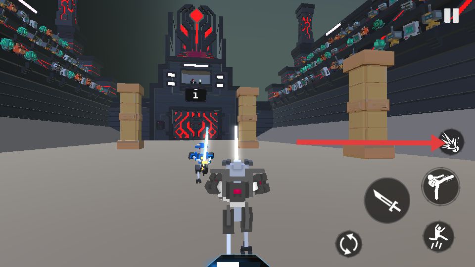 2、靠近敌人后,需点击箭头指向的剑形攻击按钮,使用机甲的近战的武器对敌人发起基本攻击,造成伤害。