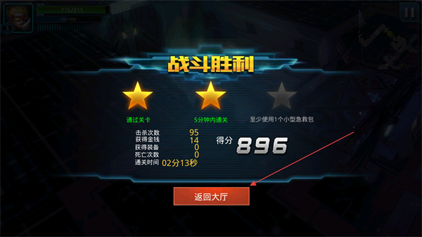4、完成关卡后显示战斗胜利,查看得分与星级,点击返回大厅结算并准备下一关。