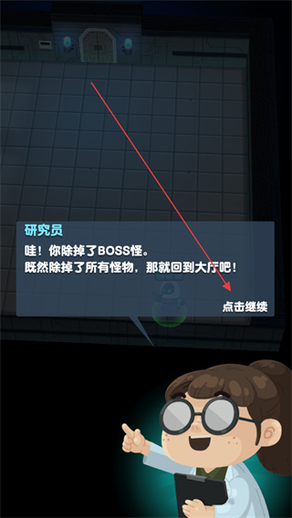 4、消灭BOSS后,点击继续回到大厅,完成关卡挑战,可继续探索新的实验室区域。