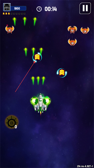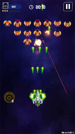 4、不断清理敌群、收集道具,维持战机生存,冲击更高分数。