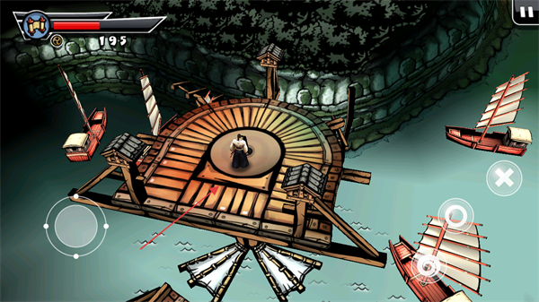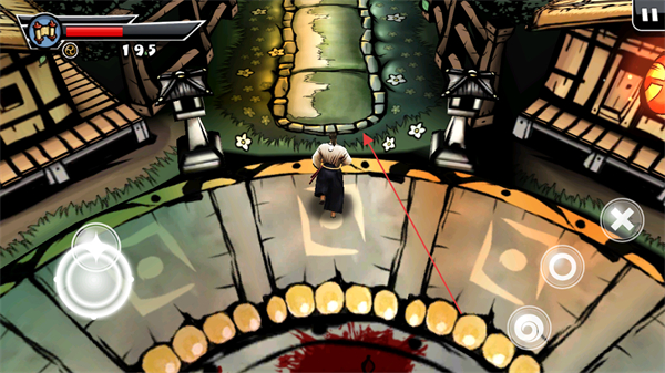 2、战斗结束后,操控武士移动,前往新的场景区域,探索不同地图如花园小径、水上平台等。