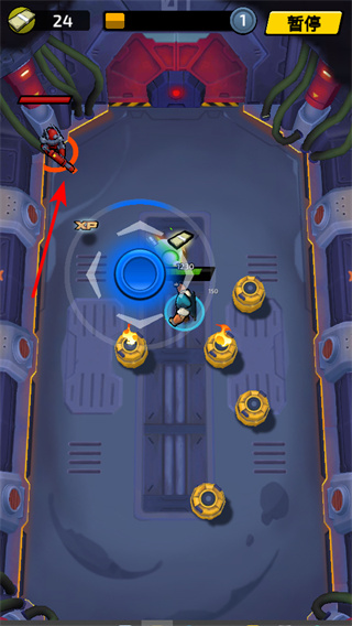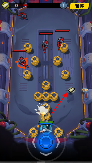 2、在布满黄色装置的场景中,攻击敌人的同时留意XP标识的经验道具,收集后加速角色成长,助力通关。