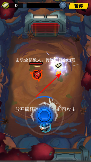 3、按照提示,放开摇杆静止时即可攻击敌人,击杀全部敌人后传送门会出现,消灭敌人以触发传送门。