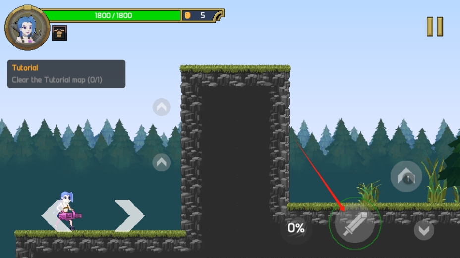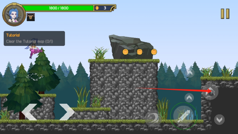 4、点击攻击按键,可发起攻击引发能够跳跃到高台来获取金币奖励,提升角色战力。