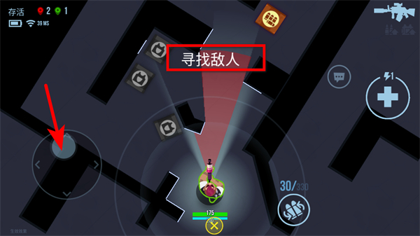 2、通过左侧虚拟摇杆移动角色,利用视野寻找敌人,瞄准后进行射击。