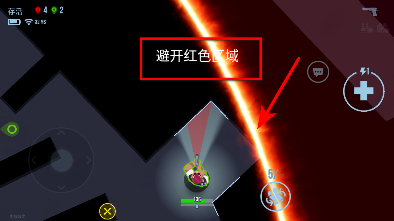 3、游戏过程中注意避开红色区域,该区域会对角色造成持续伤害。