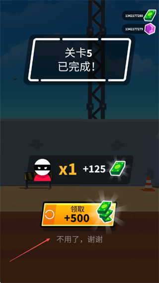 4、关卡完成后,可选择领取奖励或点击不用了,谢谢,继续挑战下一关。