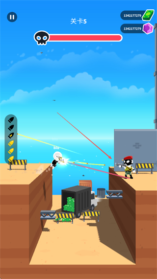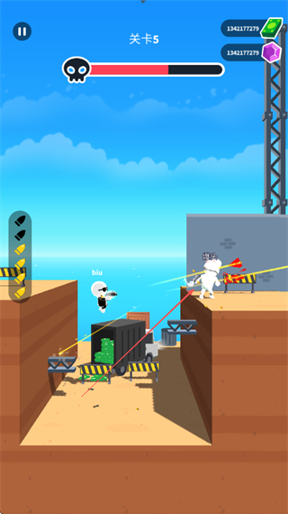 1、在关卡5中,瞄准敌方目标,发射子弹,利用子弹弹射消灭敌人,注意上方进度条显示的关卡进度。