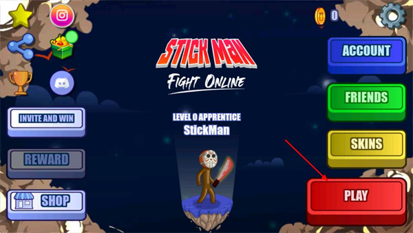 1、打开StickManFightOnline主界面,找到红色PLAY按钮并点击,进入游戏模式选择页面。