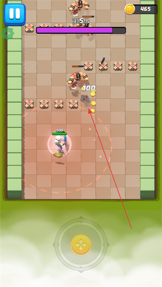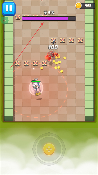 1、战斗中控制角色移动,自动攻击敌人,消灭敌人可获得金币和经验,注意躲避敌人的攻击范围。