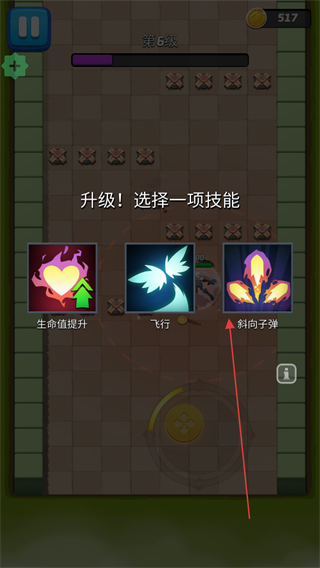 3、升级时选择合适的技能如斜向子弹,提升攻击方式和范围,增强战力,应对后续更强的敌人。