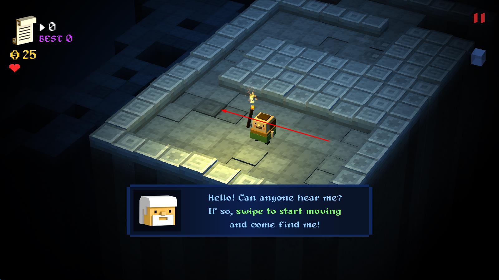 1、进入任务守卫者官方版后,先熟悉滑屏操作方式,滑动屏幕确定角色初始前进方向,开启首次地牢探索,留意周围环境寻找首个任务目标。
