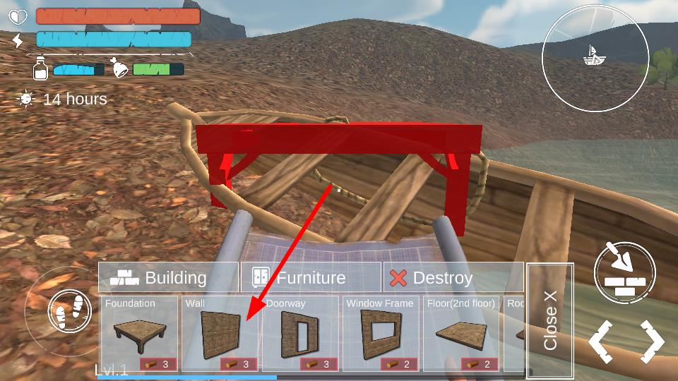 4、在建筑界面中,选择箭头指向的墙建筑模块,场景中建造墙体,用于搭建房屋,提升生存保障。