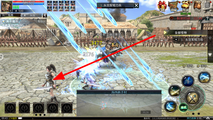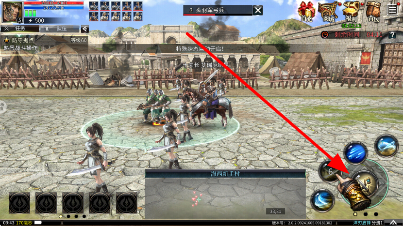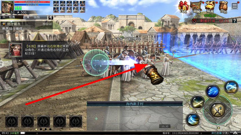 2、进入战场后,长按屏幕并向右侧滑动来移动角色,通过角色右侧的蓝色标示线,精准调整角色位置,熟悉战斗操作方式。