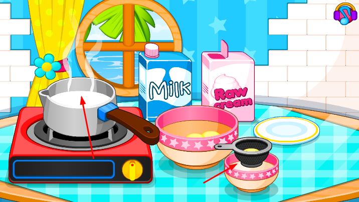 2、进入制作环节,按照指引,将准备好的食材进行处理,将牛奶倒入锅中加热,处理生奶油等食材,进行冰淇淋的制作操作。