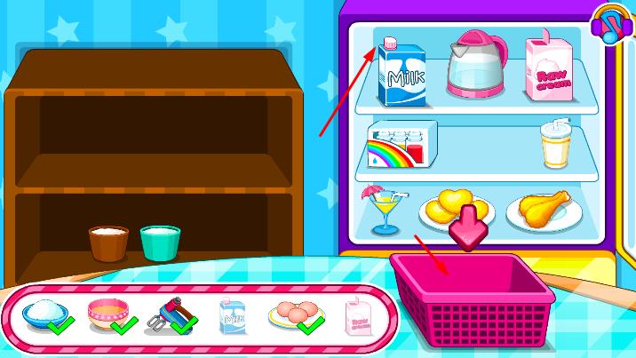 1、进入游戏,在主界面点击Play按钮,进入食材准备环节,在冰箱中选择对应的食材,点击食材将其放入粉色的篮子中。