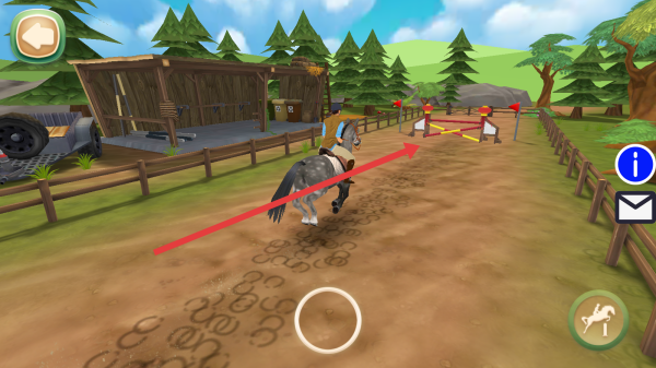 2、骑马闯关时,移动下方的圆圈操控角色沿赛道前进,遇障碍提前调整方向,点击跳跃按钮右下角让马跨越。