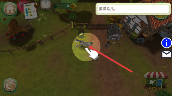1、进入游戏,首日任务摸摸马儿,点击马匹所在区域,完成互动,提高跟马儿的亲密度。