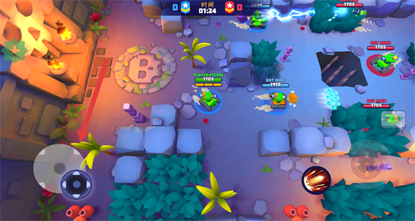 2、在开始游戏后,可通过左下角的操纵杆,操控坦克在地图场景中移动。