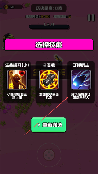 2、消灭怪物后会出现技能选择界面,可选择生命提升,2倍镜,子弹反击等技能,增强角色战力,助力后续战斗。